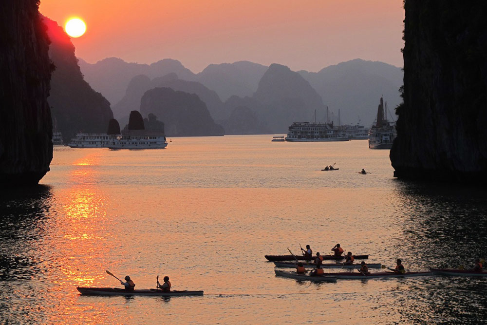 Travel through the fertile countryside of the Red River Delta en-route to Ha Long City. Enjoy the emerald waters and stunning scenery as you cruise through the limestone peaks that make this a World Heritage site. After a delicious lunch you can kayak among the hidden areas of the bay around the Luon Cave. Swim and relax at Soi Sim beach or take an energetic walk to reach the breath-taking view from the top.